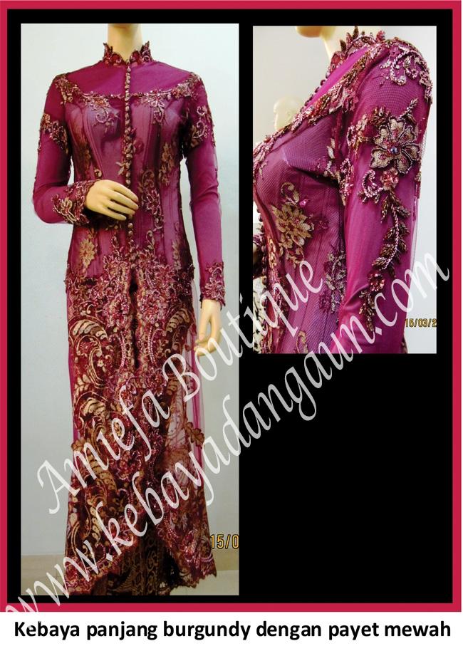 Kebaya panjang burgundy dengan payet merah