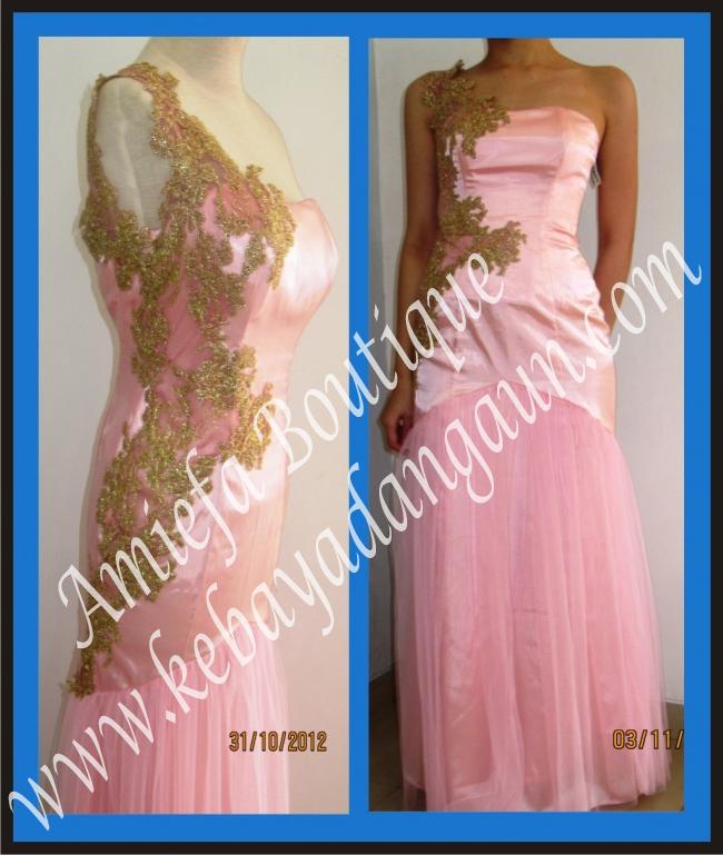 Gaun Asimetris Pink dengan Aplikasi Brukat dan Tulle